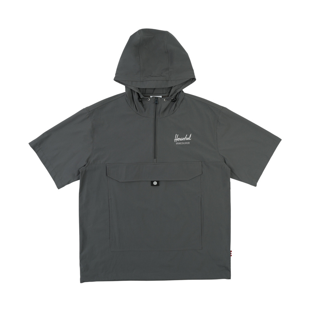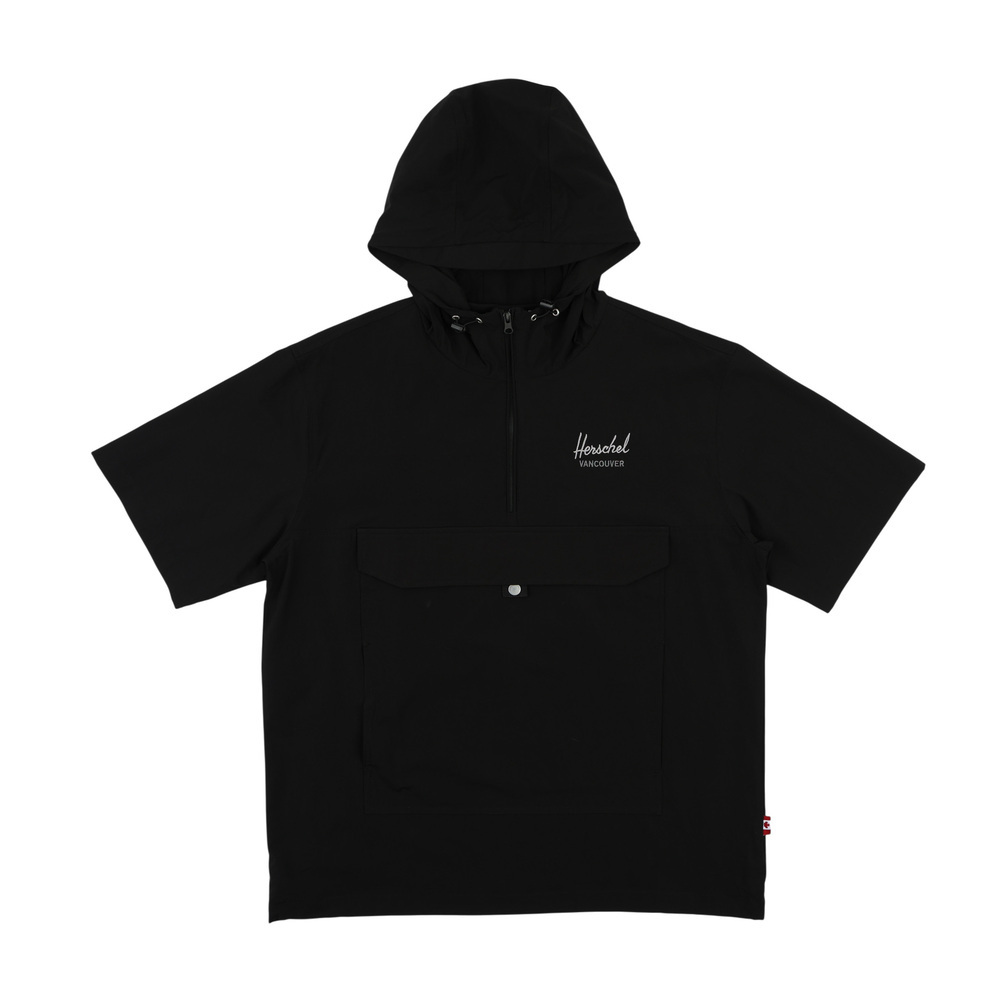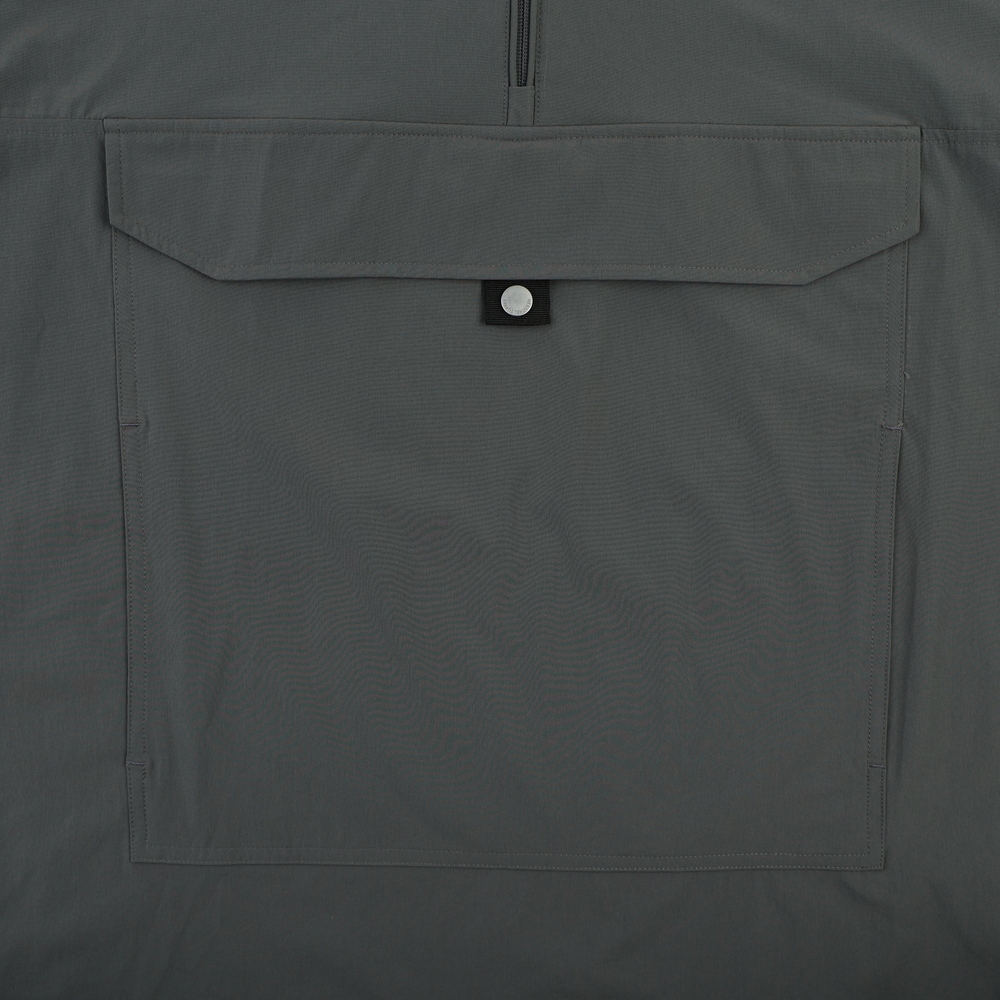 此款中性連帽上衣採用風衣布料製作,輕量卻具機能性,搭配半開襟設計,提供多樣穿搭變化。多口袋配置提升實用性,同時強化整體造型感;後背擋風片下方加入網布通風設計,在活動時保持良好透氣性。胸前點綴經典LOGO標誌
