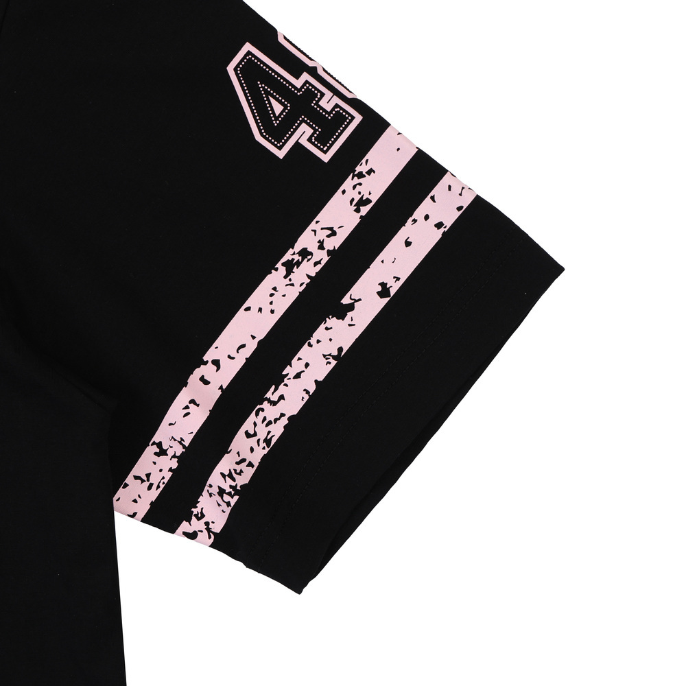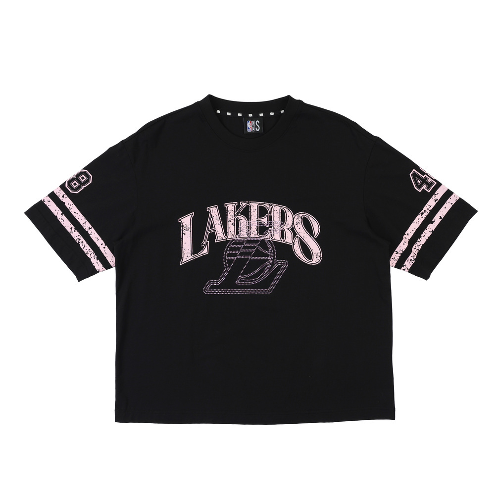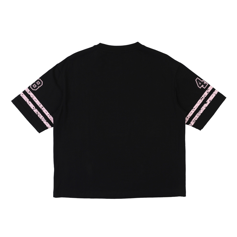 女款類球衣寬鬆短T,以輕薄涼感的冰瓷棉面料,搭配低飽和隊名印花更顯復古感;精緻水鑽讓整體呈現個性女孩的俐落風格。