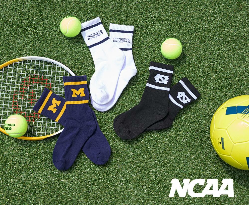 一款專為喜愛大學運動隊的男性設計的長襪,印有各大學隊伍的標誌和顏色。